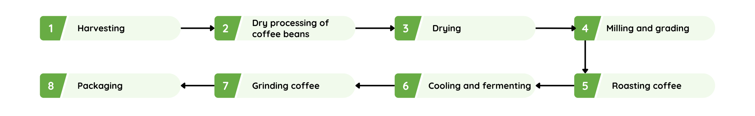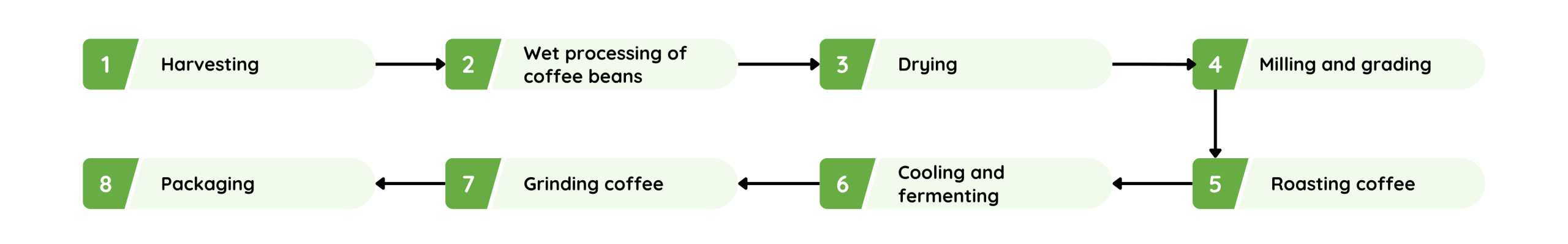 | 8. Packaging | After being ground or left as whole beans, the roasted coffee is sealed in packages for preservation. |